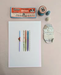 A5 unframed artworks featuring hand cut found paper shapes alongside a vintage haberdashery or stationery item adorned with delicate hand stitched needlelace. Ready for you to pop in a frame that fits your decor (or just prop it on a shelf, I won't judge!) One of each available, just choose from the drop down menu.